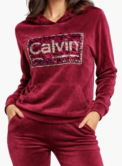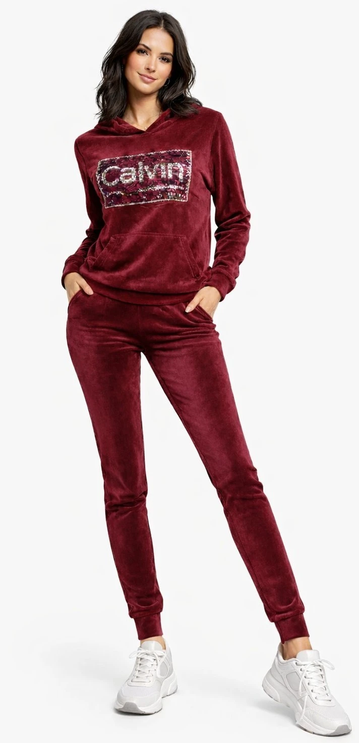 Dres damski welurowy z kapturem Cekiny bordowy (rozm. S-XL)