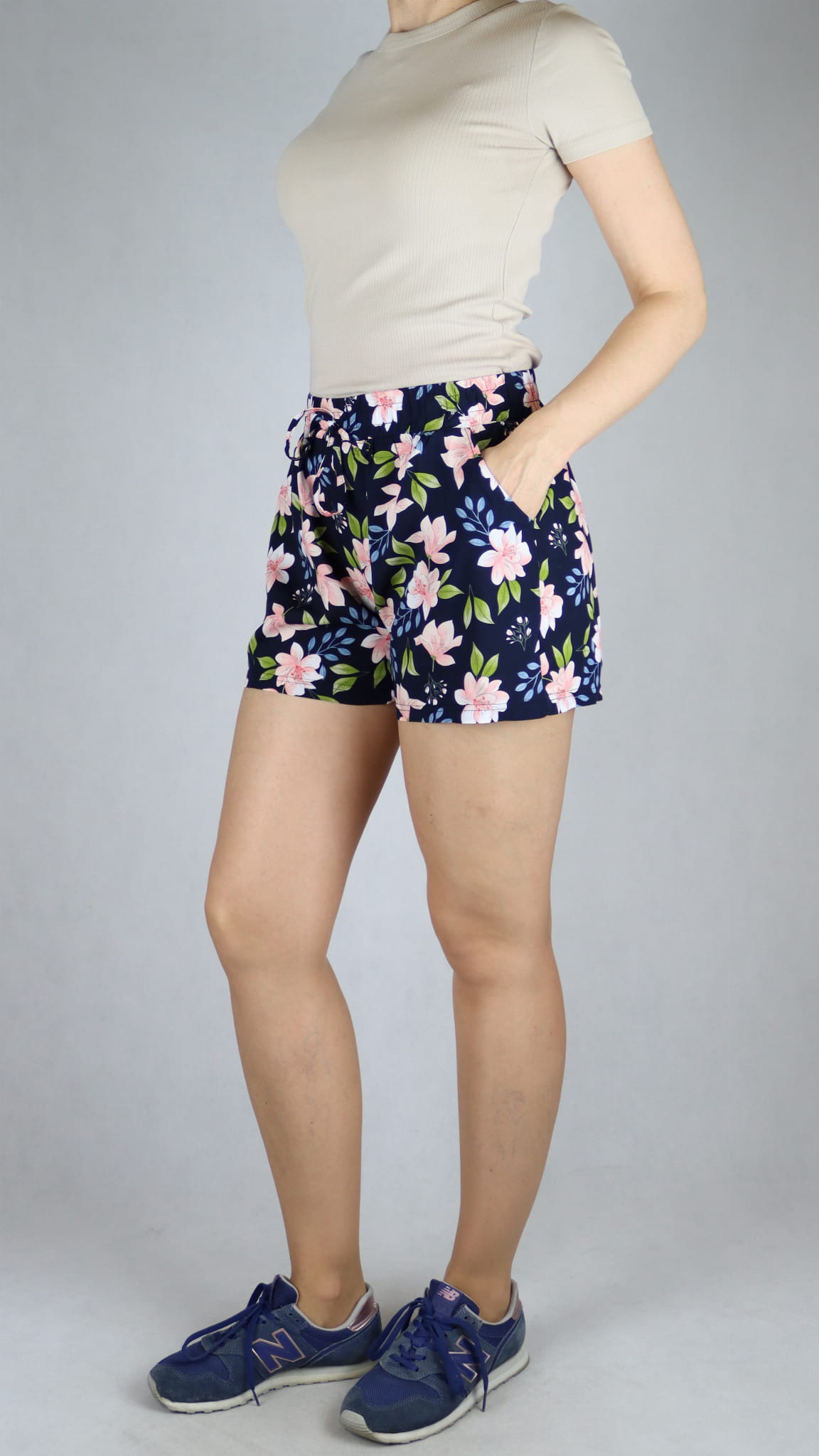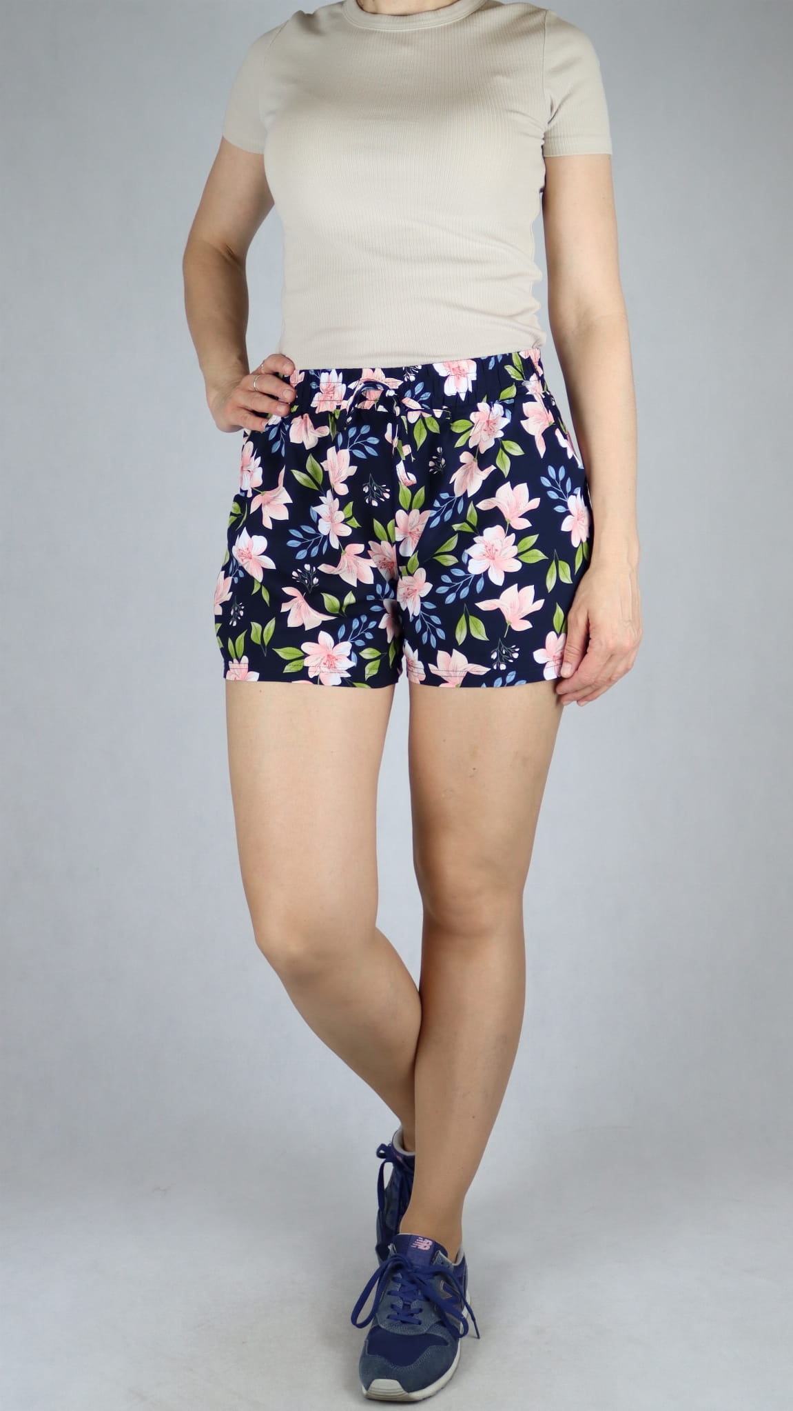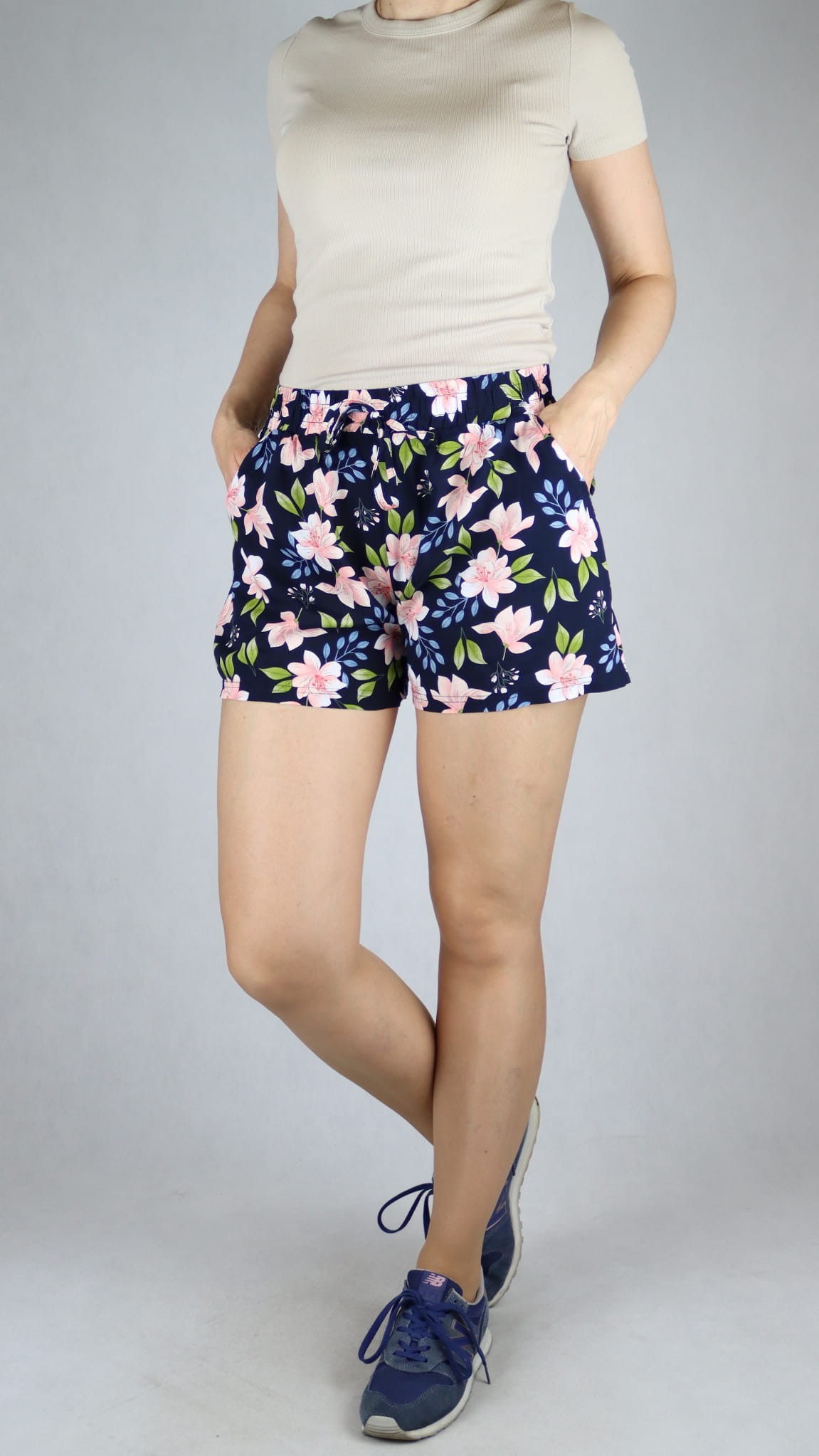 Luźne bawełniane szorty damskie zdobione wzorem kwiatowym.
