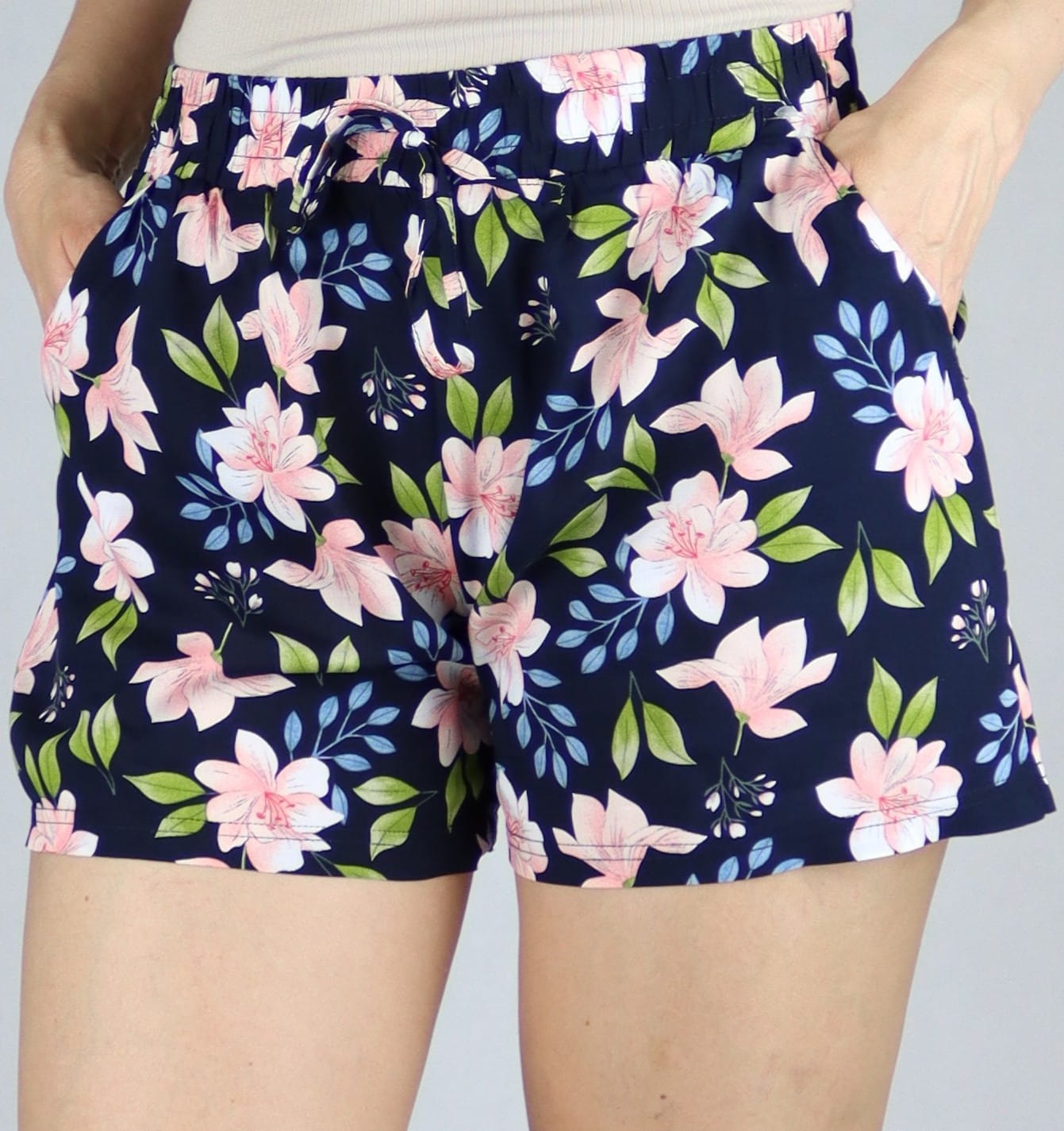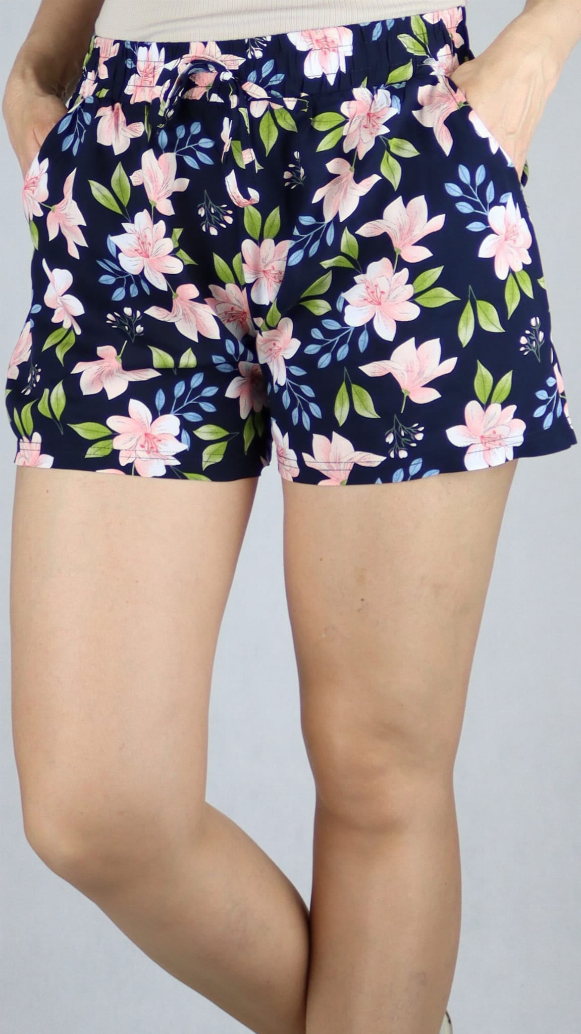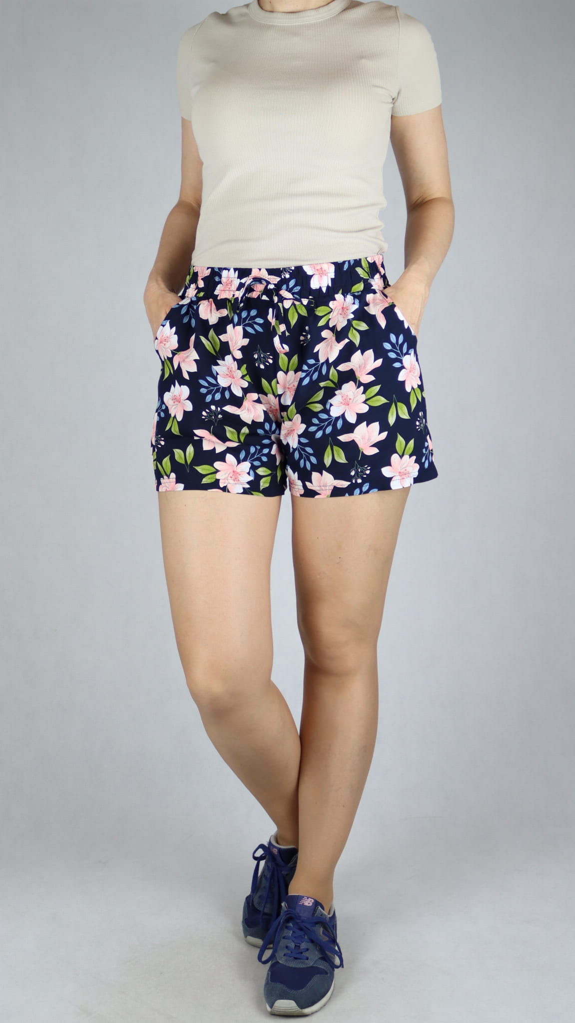 Luźne bawełniane szorty damskie zdobione wzorem kwiatowym.