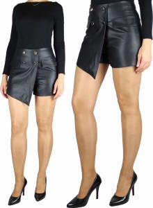 Spodenki damskie z zakładką spódnico - spodenki z patkami skórzane z guzikami czarne (rozm. 36-44)