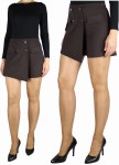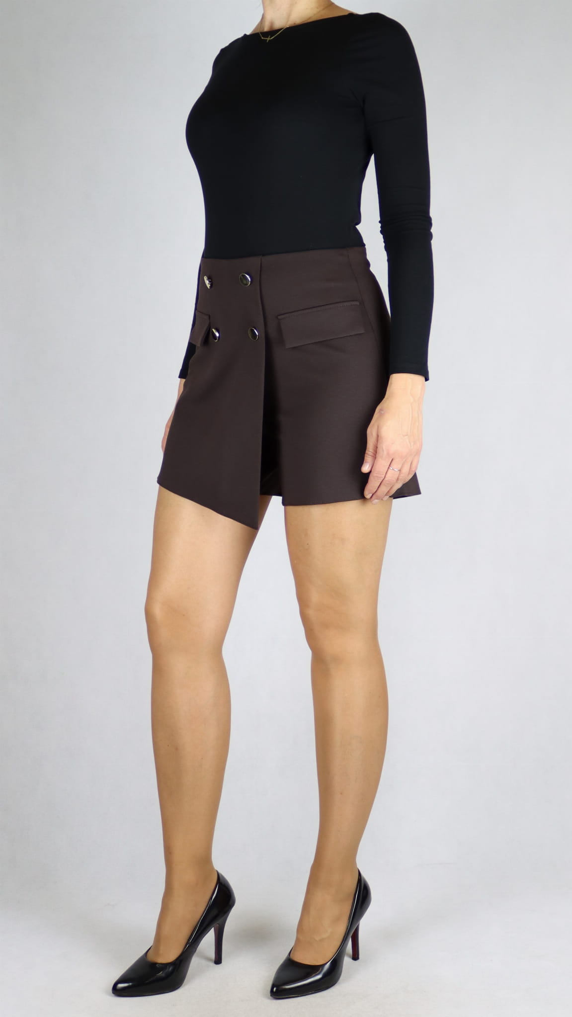 Spodenki damskie z zakładką spódnico - spodenki z patkami z guzikami brązowe (rozm. 36-40)